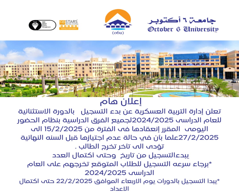 The October 6 University is the first private university in the Arab Republic of Egypt. O6U is instituted by the Republican Decree number 243 1996. The university is a member of the Association of Arab Universities and the Association of African Universities. The University includes thirteen Faculties, University Hospital, and two hotels for male and female students. It has also established a center for quality assurance and accreditation having units in all the faculties, to enhance and disseminate quality culture. The University comprises a modern library.